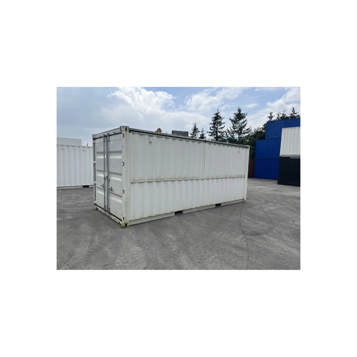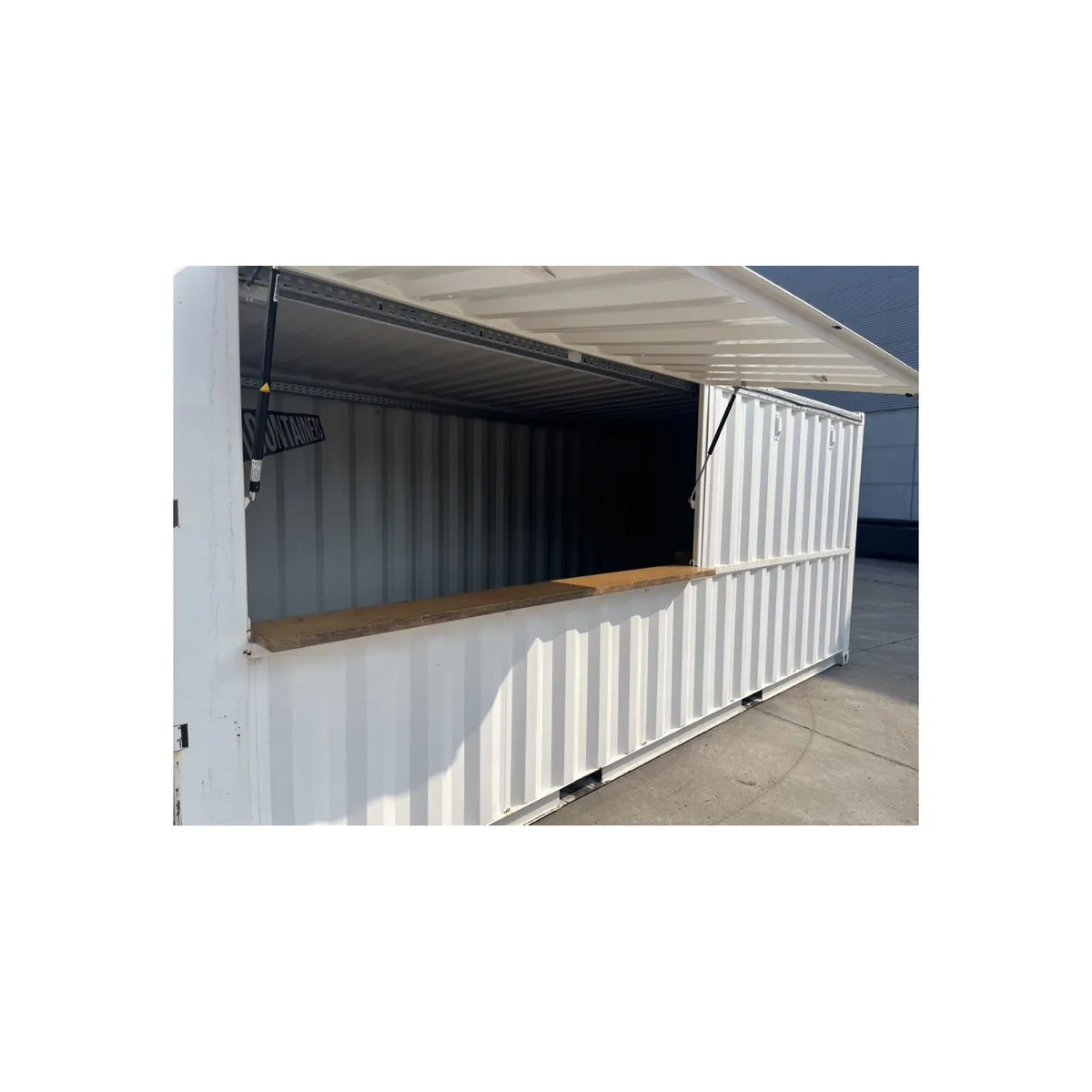 Voor wie een degelijke, werkbare bar- of verkoopopstelling zoekt zonder gedoe. Deze standaard 20ft zeecontainer is verbouwd met twee verkoopluiken met klaptoog over de lange zijde, zodat je meteen een brede servicezone krijgt. Ideaal voor drukte: twee bedienpunten, betere flow en minder wachtrij-stress.