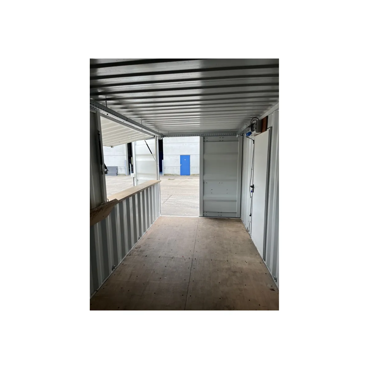 Met containerdeuren op beide korte zijdes en een metalen loopdeur in de achterwand kan vlot naar binnen langs alle kanten. Binnen is er een standaard elektrische installatie met 4 dubbele stopcontacten, netjes verdeeld over de vier hoeken—handig voor frigo’s, koffiemachine, verlichting, kassa of muziek.